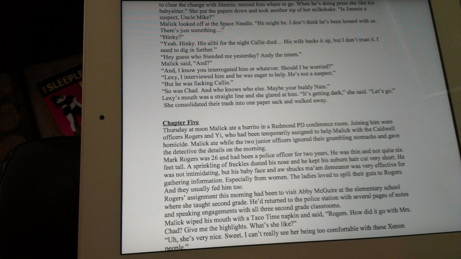 The best thing–and thanks to my friend Kiki for teaching me about this–is Kindle Personal Documents. What this means is that I email a Word doc to myself at my kindle.com email address (if you have a Kindle, you have one), and it shows up on my Kindle like a regular ebook!! Which is crazy awesome when you plan to publish via Kindle. This way I can read my book the way it will someday look to actual readers (plus see where the formatting is fucked up.) Looks cool, huh?