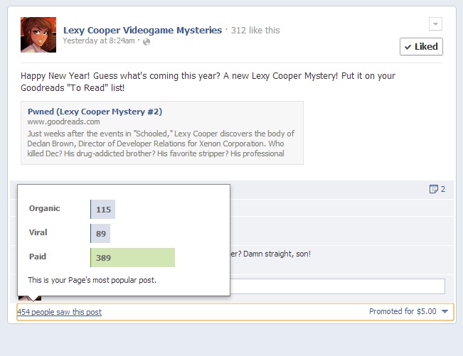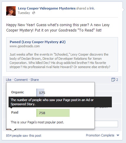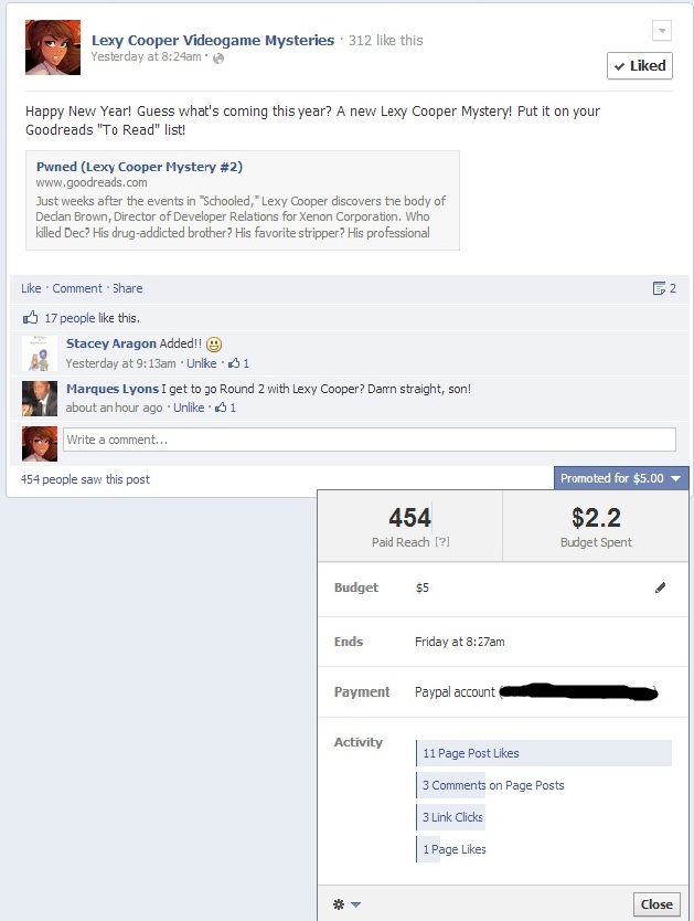 I decided to celebrate the new year by announcing the title, plot, and expected publication date for my next Lexy Cooper mystery. I created a Goodreads entry using a color study Brett Parson did for Schooled, and posted the link on my Lexy Cooper Facebook page. Once posted, I saw an option to promote the post for five bucks. Five bucks, huh? Okay, I’ll bite. Here’s what happened:
