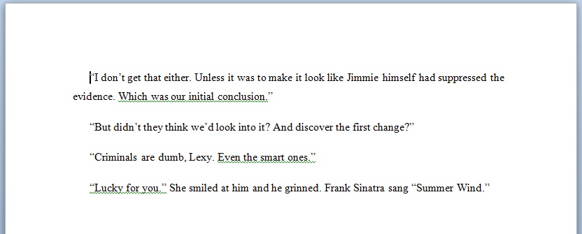 Here I added three sentences to the end of the scene. It doesn’t move the plot any further along, but it gives some clues as to Mike and Lexy’s relationship, and humanizes the usually hardass cop. He’s a fan of the Rat Pack, enjoys veal, and knows all the words to “Summer Wind.” Better, yes?