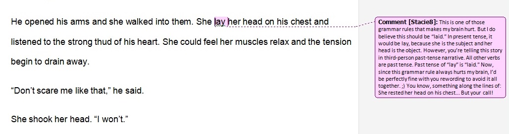 Need another hotly-contested grammar debate? Of course you do! Stacie - lay laid debate That bit in pink says: “This is one of those grammar rules that makes my brain hurt. But I do believe this should be “laid.” In present tense, it would be lay, because she is the subject and her head is the object. However, you’re telling this story in third-person past-tense narrative. All other verbs are past tense. Past tense of “lay” is “laid.” Now, since this grammar rule always hurts my brain, I’d be perfectly fine with you rewording to avoid it all together. 😉 You know, something along the lines of: She rested her head on his chest… But your call!”