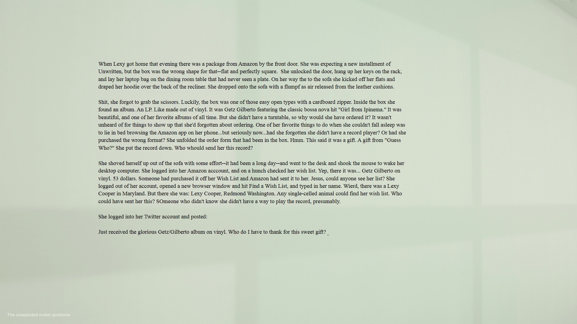 Maybe looking at it you’re thinking, So what, I can accomplish the same thing by taking my laptop to Starbucks/the park/a rubber room. Cool. Go do that. Ommwriter works for me. Works so well I’ve doubled my word output and halved the time I spend at the keyboard. Which means I could finish Lexy Cooper #3 a lot sooner than I’d anticipated OR I can write 2 or 3 days a week and enjoy more of the summer. Maybe I’ll use the time I save to write a Lexy Cooper screenplay. Or a YA prequel featuring Lexy in high school. Or finish my long-shelved non-mystery about the summer Skylab fell.