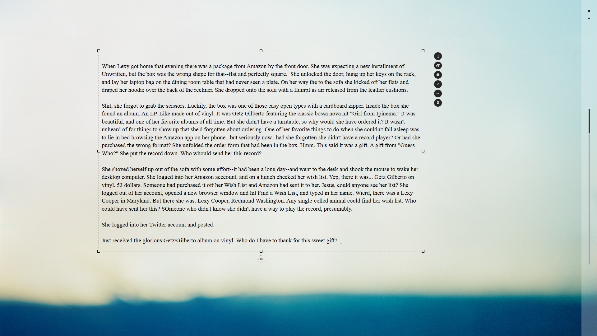 Ommwriter delivers exactly what it promises: A private writing room. It fills your entire desktop with a soothing background. I chose this one because it reminds me of the beach. As my writing fills the page I get closer to the water.  There are no formatting selections to slow you down (Ooh I need to italicize that. But wait, I should consult the Chicago Manual of Style, first–DISTRACTION!) You just type. And format later.