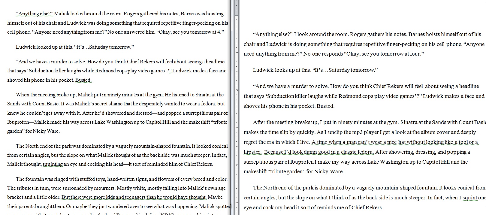 And yeah, I liked it. And my alpha readers liked it too. One of them said, “I already love it.  his dry noir wit comes comes through even when he’s taking the high road on the outside,” and another said, “seeing it through Malick’s eyes is much more telling about who he is.” So it was decided. Now I just had to do a complete rewrite on a by then 37,000 word novel-in-progress. I estimated it would take nine days to fix and then I’d be able to go forward and write the rest of the book.