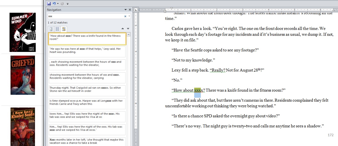 Since I use the multiple X convention, all I have to do is search for it in my document and there’s a list of all my unfinished business. I can methodically go through and replace X’s with the good stuff. (Here are some tips on character names, btw).