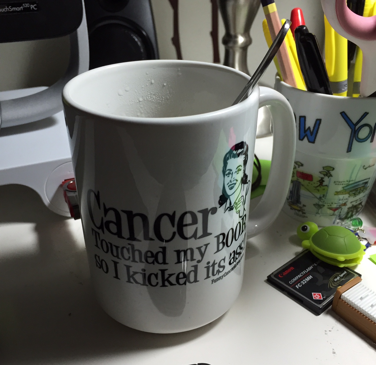 Today is Day 7. I don’t feel any stronger. I went to Target after Pony Camp drop-off and nearly had to sit down in the aisle. My pulse as I walked (according to my Apple Watch) was 38. I trolled the food aisles for anything that might pique my appetite. I grabbed two kinds of soup. When I got home I tried the vegetable, but spit out the first and only bite. Next up, creamy potato broccoli. Made it three bites, but then…NOPE. So I’m back on chicken broth, which I’m sipping from a mug my sisters-in-law sent me from Florida. It says Cancer touched my boob, so I kicked its ass!