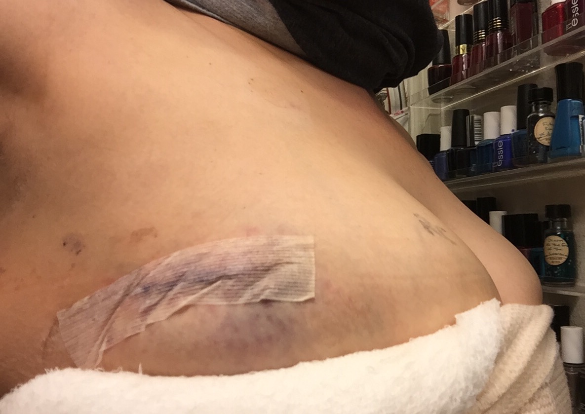 I can take it off and shower on Saturday (48 hours after surgery), but can’t take a bath or swim for three weeks. It’s sore, but really not too painful. The only annoyance so far (besides the sweaty funk I’m sure is brewing inside the boob burrito) is I can’t sleep on my right side. This morning I peeked under the bandage at Turdy’s gravesite. It doesn’t look too bad! My armpit is kinda numb.