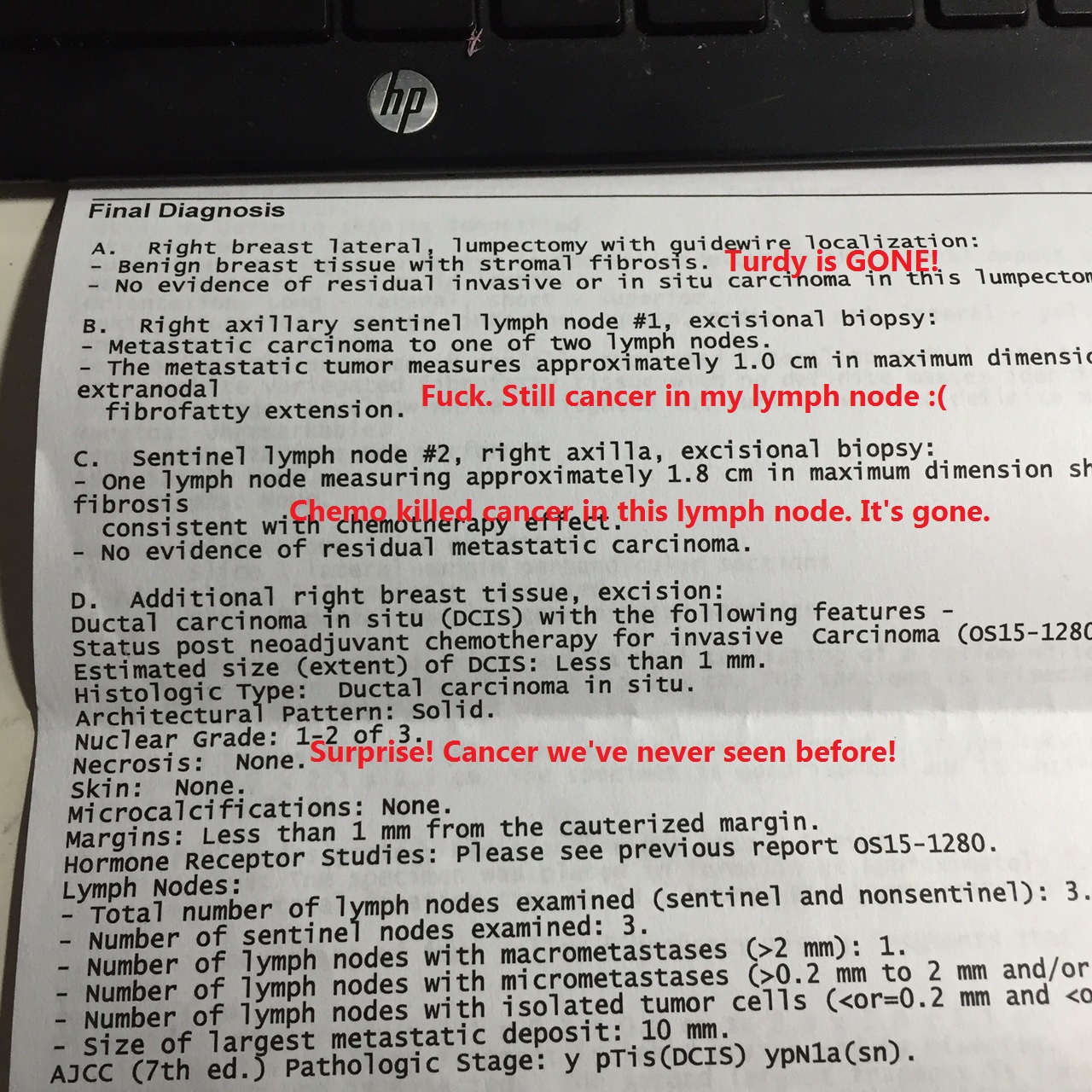 Since my last post I have calmed down a bit and also found out more information. The first thing I did was go to Dr. Supe’s office and pick up my pathology report. After much Googling, consultation with my billions of breast cancer books, and knowledge I’ve sucked up over the past six months, I had some answers. Then I had a post-op appointment with Buffy the Cancer Slayer and learned more.